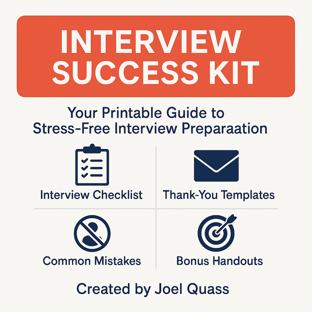 🎯 Interview Success Kit Walk into every interview with confidence and a clear plan. This printable, easy-to-use kit gives you everything you need to prepare, practice, and impress. ✅ Interview Checklist – Never forget the essentials before, during, and after your interview. ✅ Thank-You Templates – Send professional follow-ups that get noticed. ✅ 50 Interview Questions with Sample Answers – Practice with real examples so you’re ready for anything. ✅ Common Interview Mistakes Guide – Learn the pitfalls that cost candidates offers and how to avoid them. ✅ Bonus Handouts – Quick-reference pages you can print, keep, and use again and again. 📌 Created by Joel Quass, CEIP, CPRW – A career coach and résumé expert who’s reviewed thousands of applications and interviews. With this kit, you’ll be calm, confident, and ready to turn interviews into offers